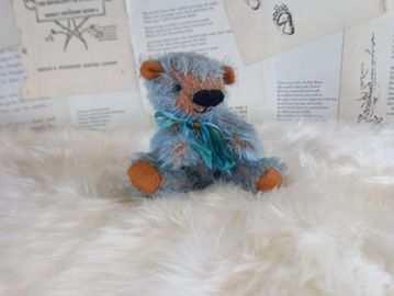 A cute pocket-sized bundle of blue mohair fluff. With his hand embroidered nose, smile and twinkly glass eyes, this little chap is the perfect size to carry with you on your travels.