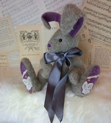 He is made from steiff schulte mohair in a lovely, light shade of grey. His foot pads and ears are made from a luxurious plum coloured felt with the footpads having the beautiful addition of some floral embroidery and appliquéd lace. Of course only the best lace will do for Phineas: Cluny leavers lace, made in the UK of course. These unique embellishments mean he really is one of a kind (OOAK).